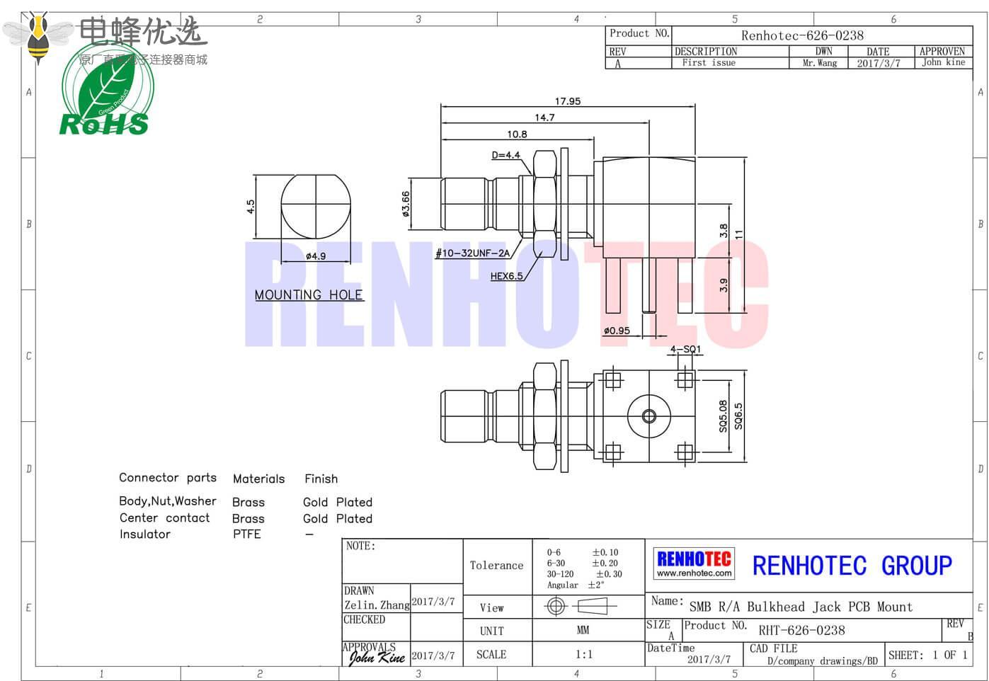 - PCB板端,母头,弯插,RF射频同轴,SMB连接器,50欧姆, 穿墙;