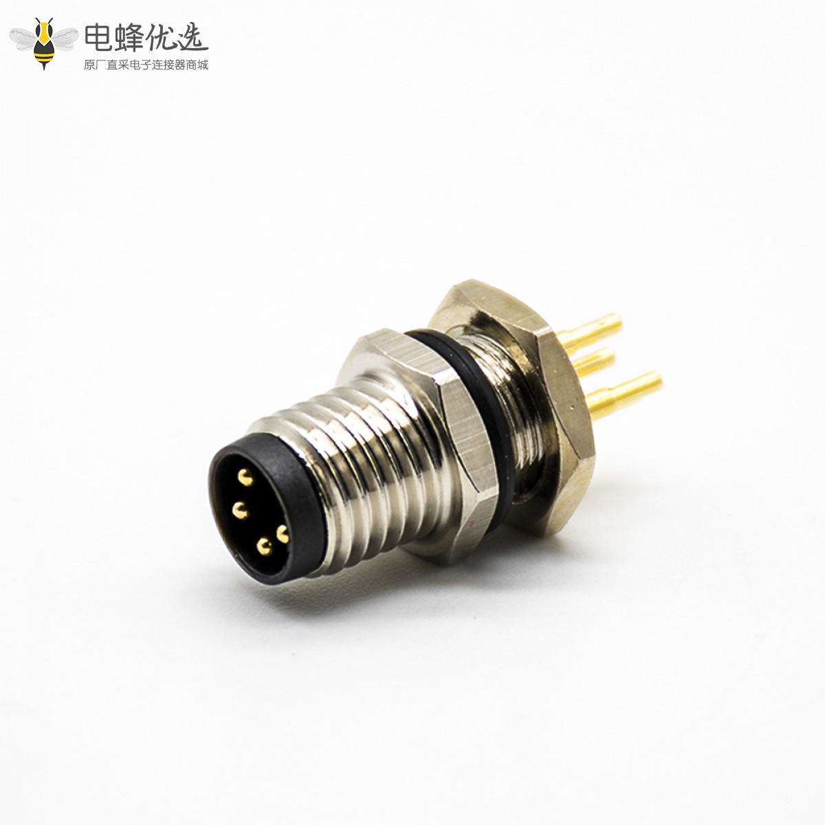- M8板端插座,180°,4芯,公头,接PCB板,焊接式,后锁板,防水;