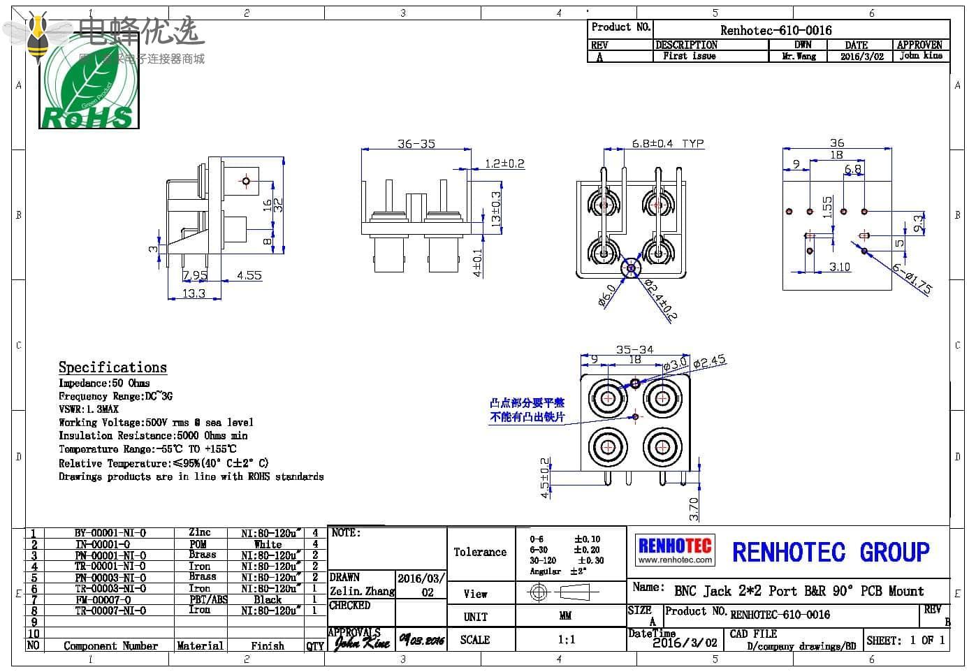 - PCB板端,母头,弯式,锌合金,RF射频同轴,BNC连接器,50欧姆,RCA;
