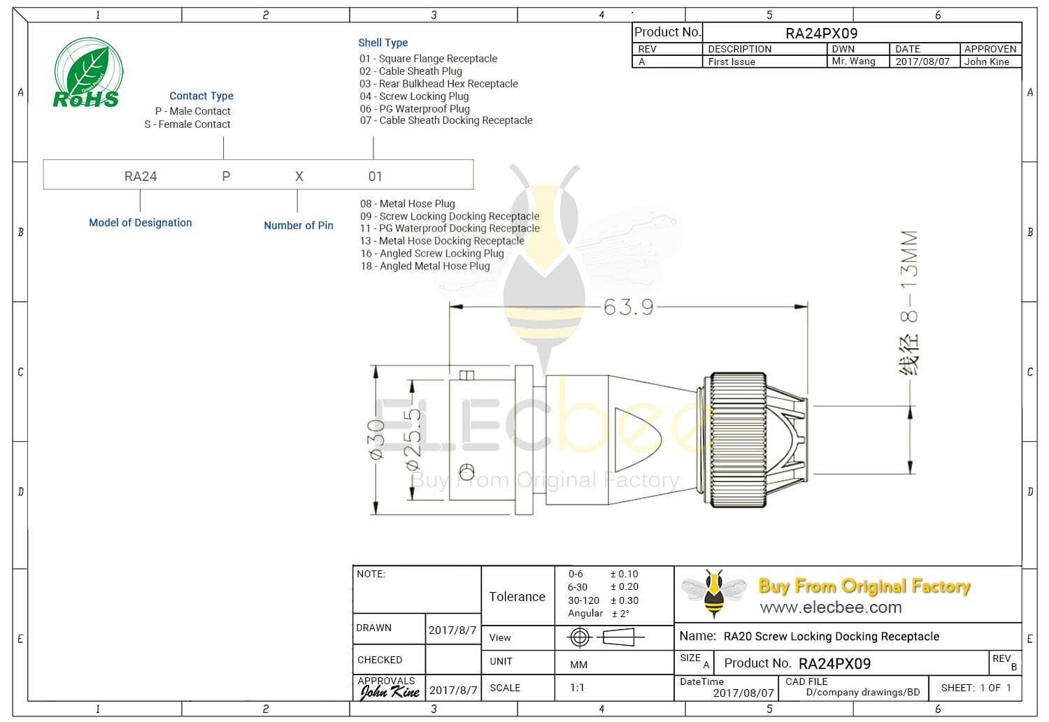 - 4芯, RA24, 螺帽锁紧对接, 直式, 座件, 母头, 防水, 航空工业连接器;