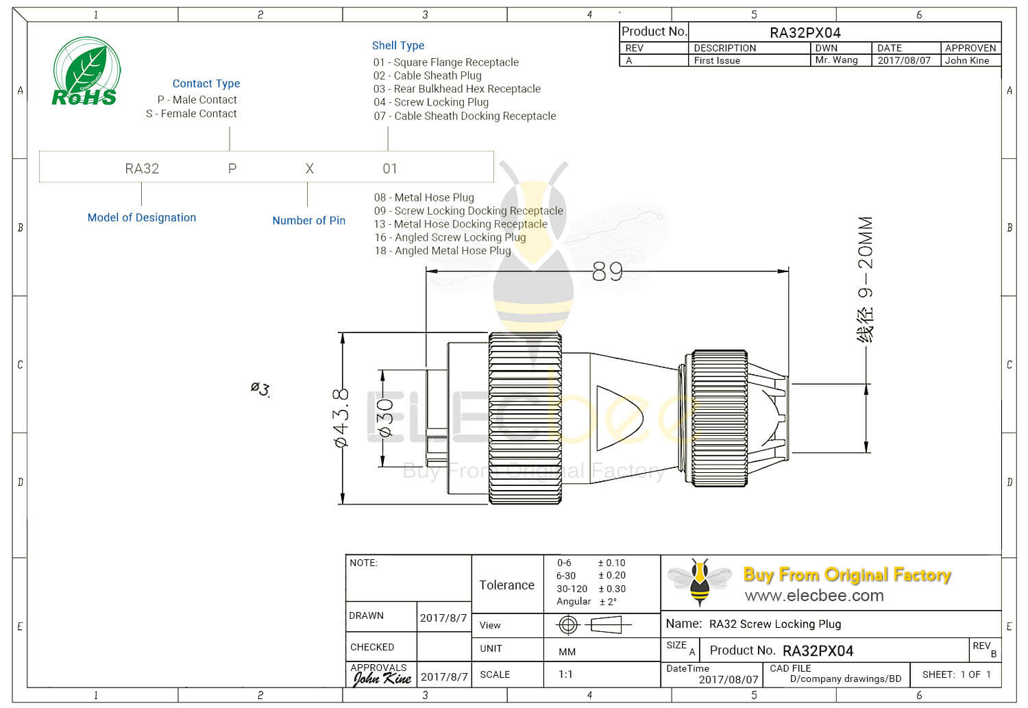 - 4芯, RA32, 螺帽锁紧, 直式, 插头, 公头, 防水, 圆形工业防水航空连接器;