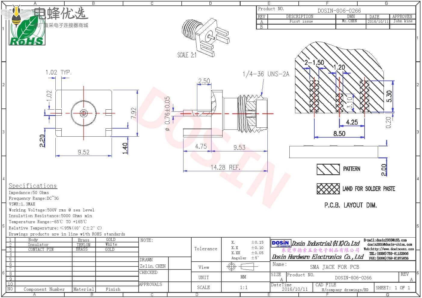 - sma连接器,直式,50Ω,反极,母头,边缘卡板,镀金;