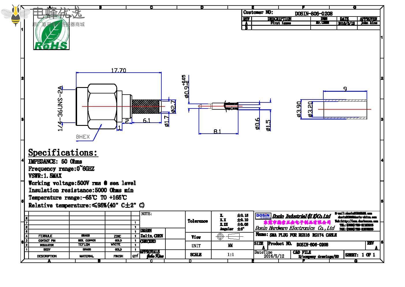 - sma连接器, 同轴线缆, 直式,50Ω, 母头, RG174,镀金;