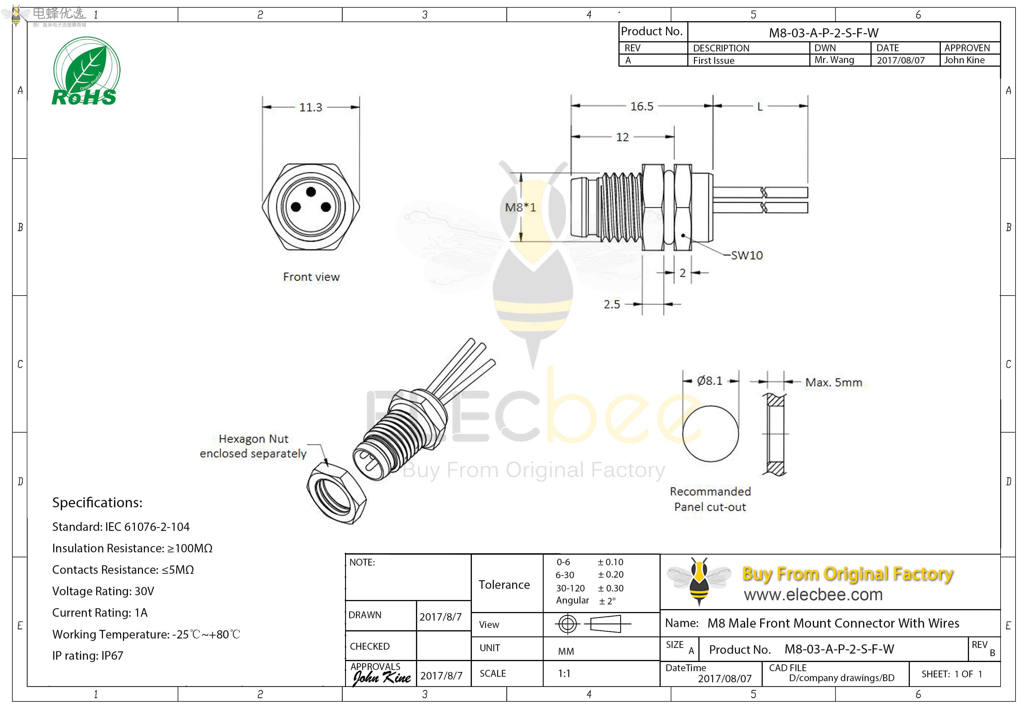 - M8, 3/4/6/8芯, A型, 公座, 前锁板, 直式, 防水, PCB;