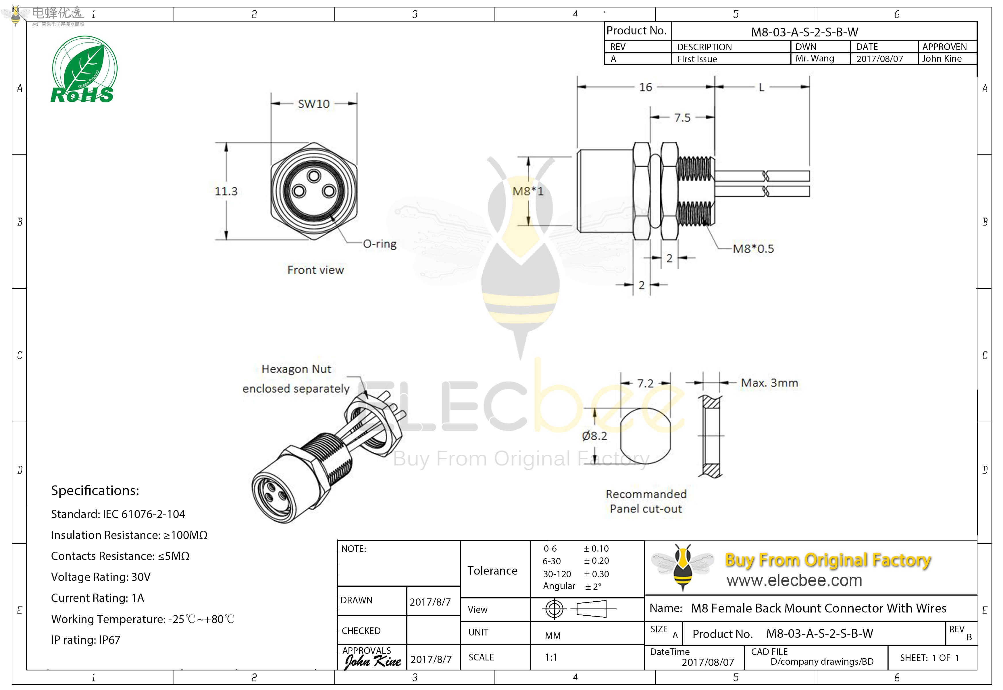 - M8, 3/4/6/8芯, A型, 公座, 后锁板, 直式, 防水, PCB,焊接;