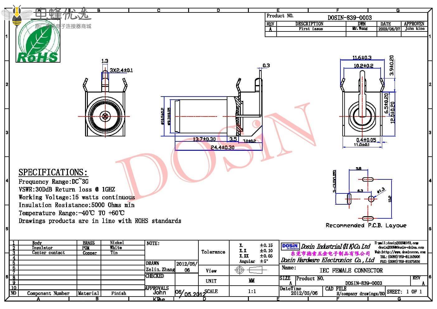 - 绝缘电阻:≧ 1000 mΩ (Megohms min.)