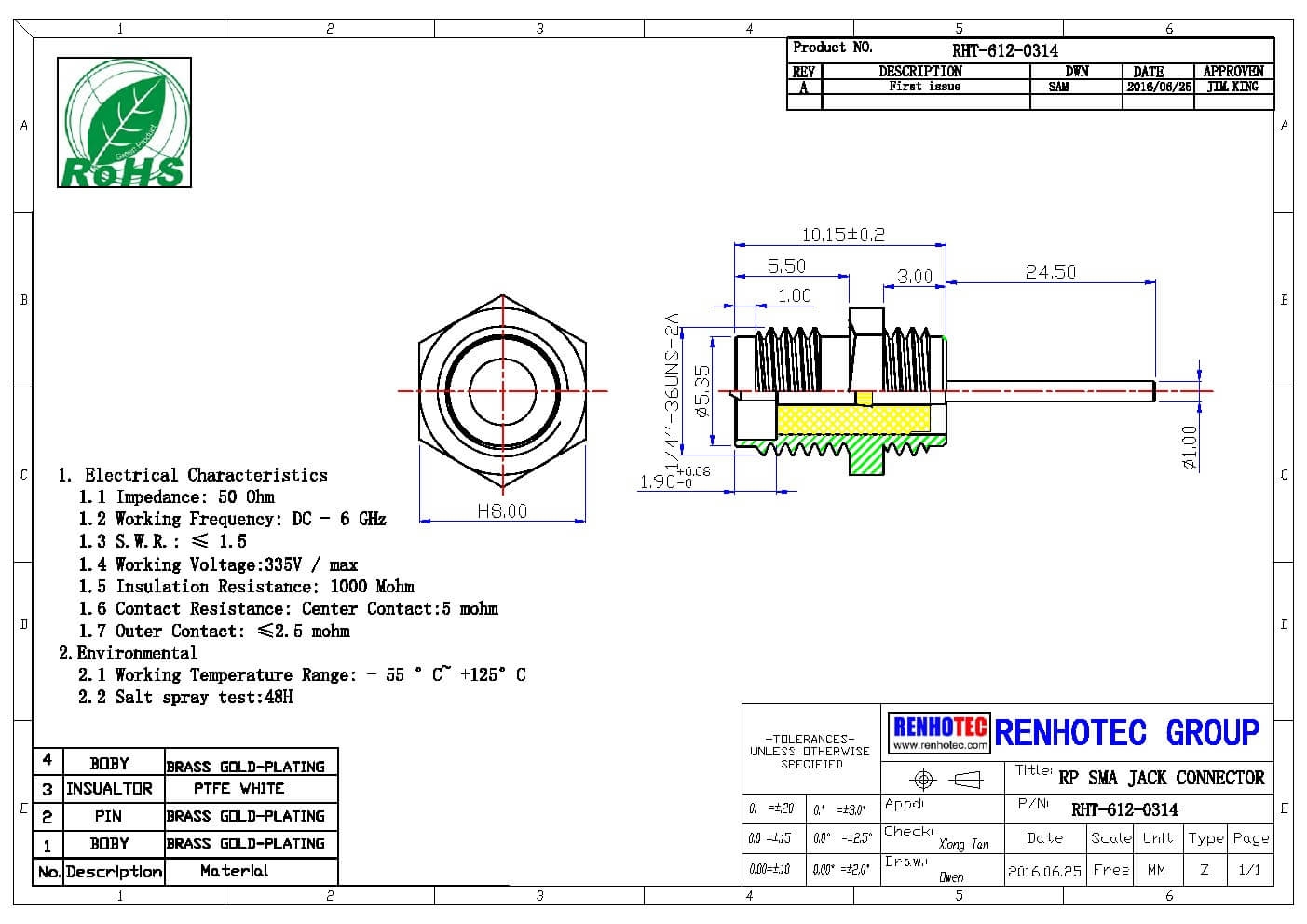 - 中心接触电阻:≦ 6.0mΩ (Milliohms max.)
