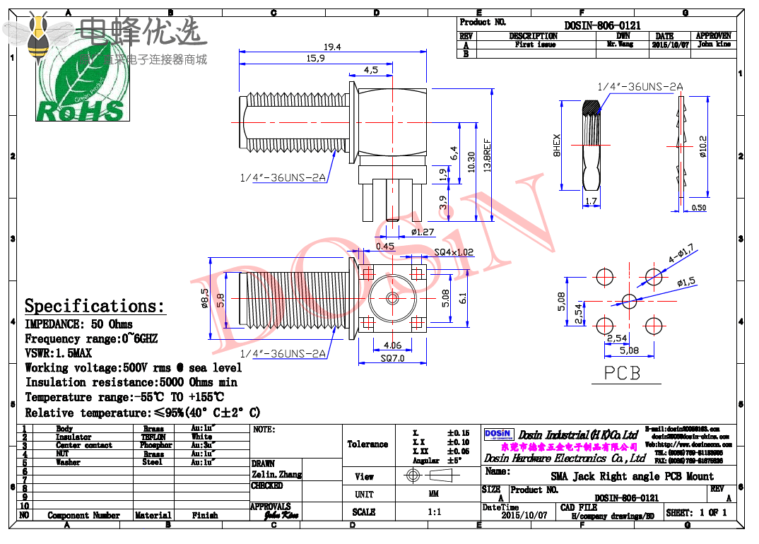 - SMA连接器,弯式,母头,Pcb板,插孔,镀金;