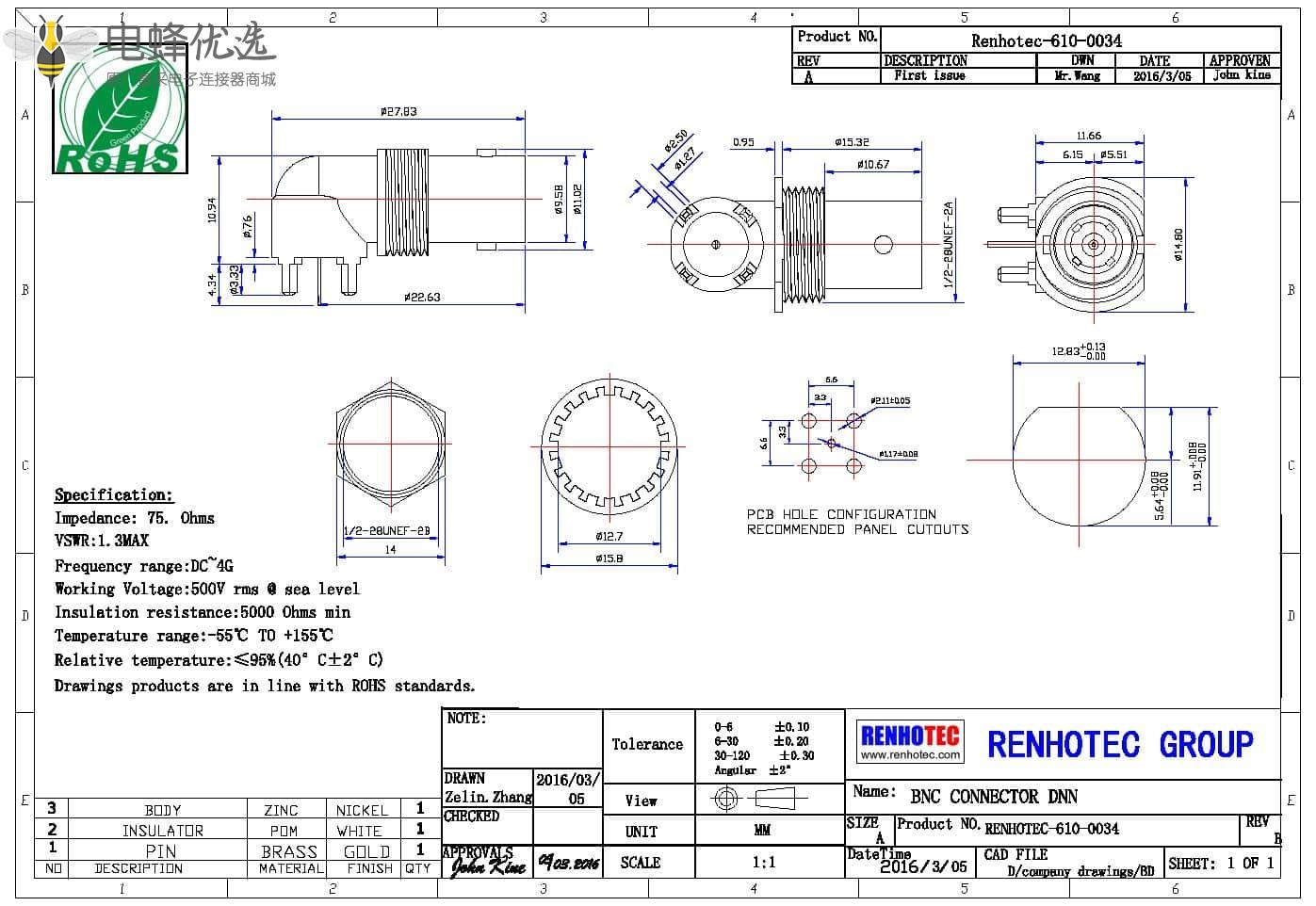 - PCB板端,母头,弯式,锌合金,RF射频同轴,BNC连接器,4脚,穿墙,75欧姆,穿墙;