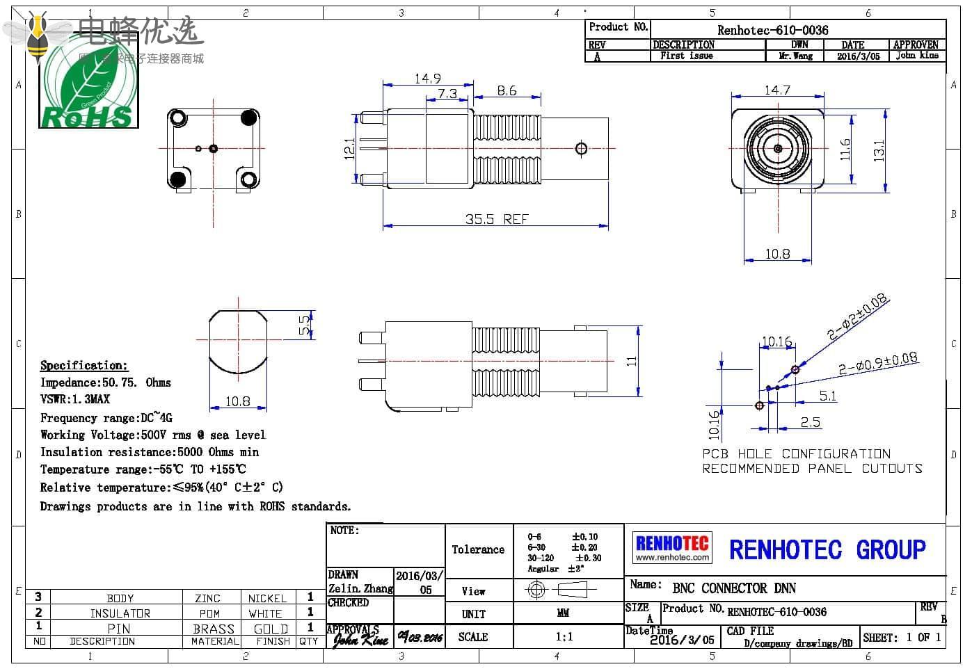 - PCB板端,母头,直式,锌合金,RF射频同轴,BNC连接器,穿墙,50欧姆,75欧姆;